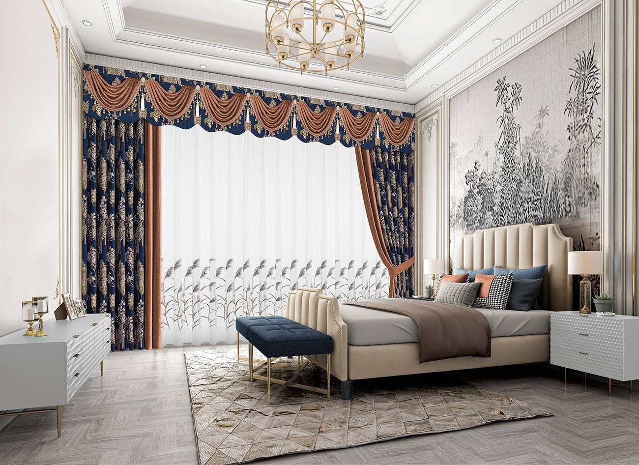汲取花的靈感,綻放于面料之上,真實(shí)的筆觸靈活展現(xiàn)花的姿態(tài),搭配背景墻,如踏入一片花海叢林,空間更加生動(dòng)。